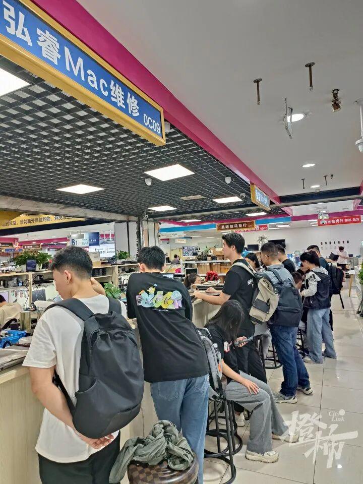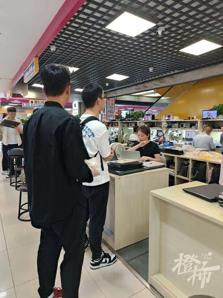 在百脑汇“弘睿Mac维修”等待修电脑的年轻人
