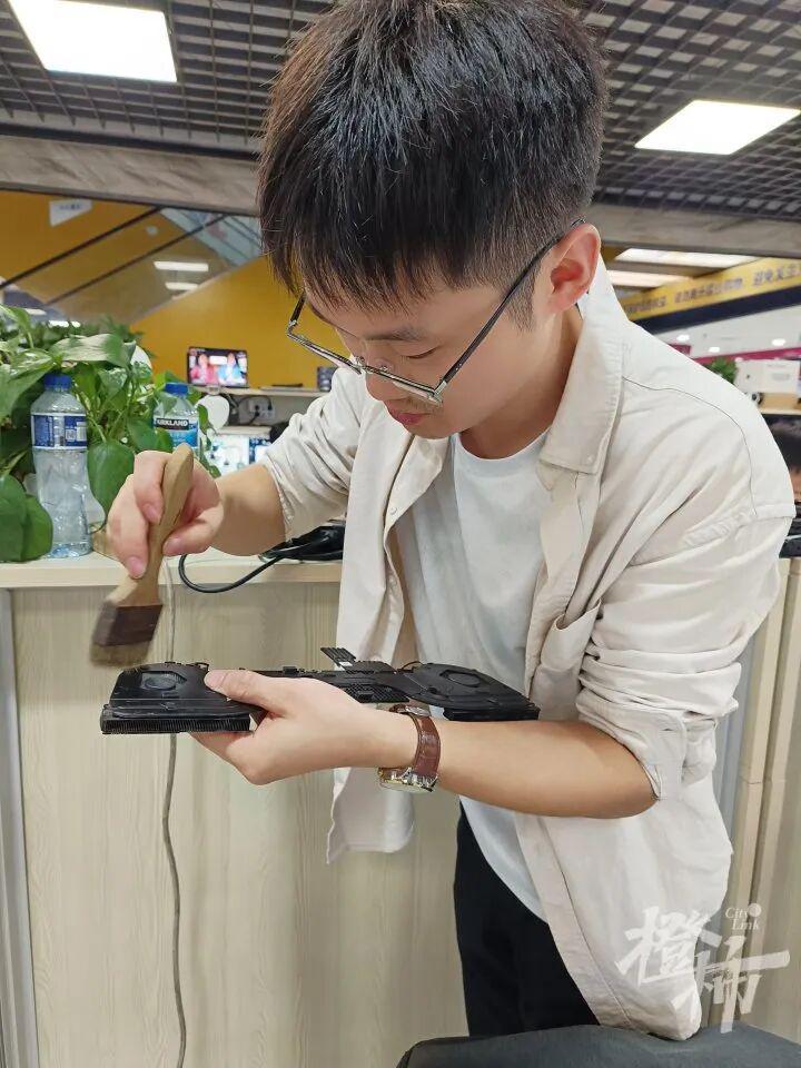 在电脑维修的间隙,小陈借来毛刷清理风扇的灰尘。