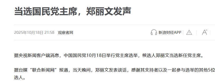 2025年10月18日,郑丽文以过半票数当选国民党主席,成为该党历史上首位具有民进党背景的女性党魁。这一选举结果不仅标志着国民党的内部革新,也引发了岛内政治格局的深刻变化。