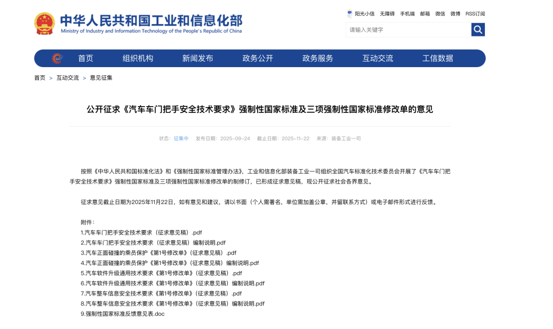 9月24日,工信部就《汽车车门把手安全技术要求》强制性国家标准公开征求意见,拟于2027年实施。