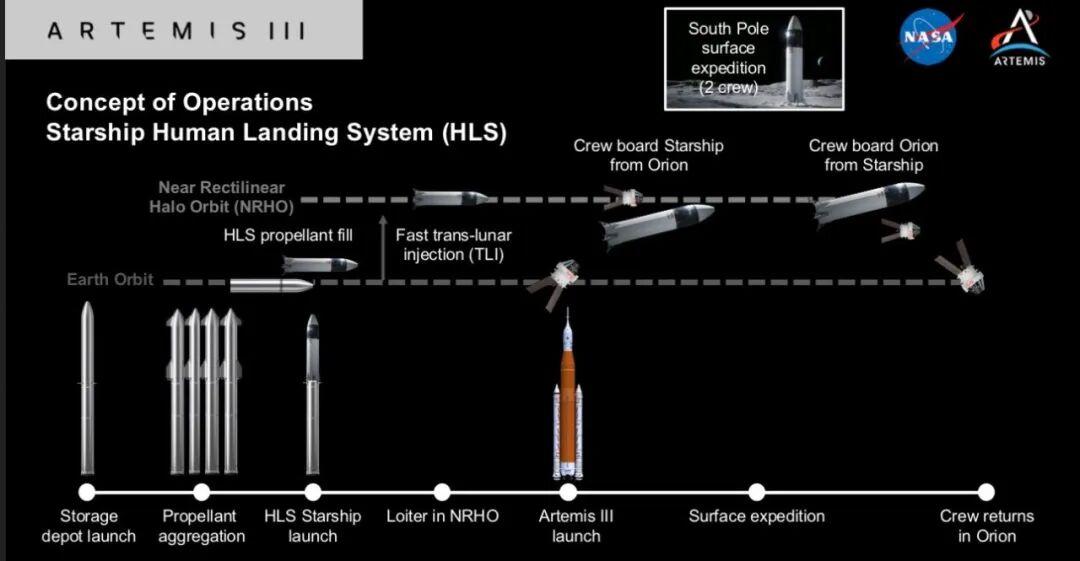 报告首次详细披露了登月版星舰(HLS)的轨道加油流程。贮存版星舰(Depot Starship)作为「轨道加油站」,将率先发射入轨并优化低温推进剂蒸发控制技术。随后,多艘加油版星舰(Tanker Starship)通过多次对接,为其补充甲烷和液氧。登月版星舰完成燃料加注后,将前往近直线晕轨道(NRHO),与猎户座(Orion)飞船对接并转移两名宇航员。宇航员将在月面停留6.5天,执行舱外活动(EVA)。目前,SpaceX已成功测试真空版猛禽发动机冷启动技术,并计划于2026年开展大规模轨道转移演示。