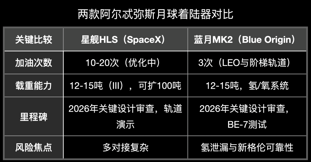 相比之下,Blue Origin的路径看似更为简洁。报告引述的阿尔忒弥斯操作概念显示,其蓝月亮MK2着陆器仅需三次加油:运输器(transporter)在低地球轨道完成两次补给后,再升至「阶梯轨道」(stairstep orbit)进行第三次补给。然而,这一方案高度依赖新格伦火箭的可靠性(首飞至今仅9个月)。报告虽未详述加油次数的不确定性,但强调通过冗余设计降低整体风险。