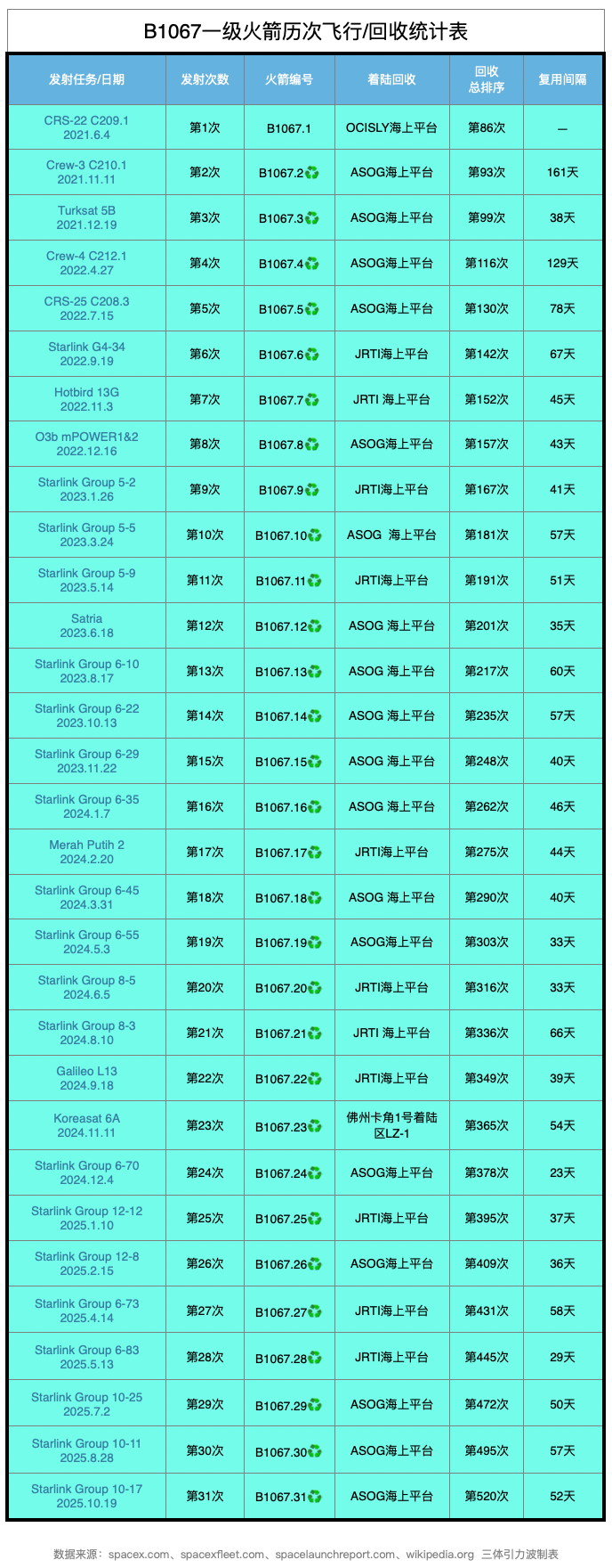 回顾B1067的辉煌历程,这枚火箭最早于2021年6月首飞,自此开启了其“航天马拉松”之旅。其履历丰富多样:两次载人龙飞船任务,将8名宇航员安全送往国际空间站;两次货运补给(CRS)任务;18次星链部署任务;甚至还包括为欧盟发射伽利略(Galileo)导航卫星。累计飞行超四年,B1067的第31飞创下了新的高度,远超SpaceX早期设定的10次复用目标。