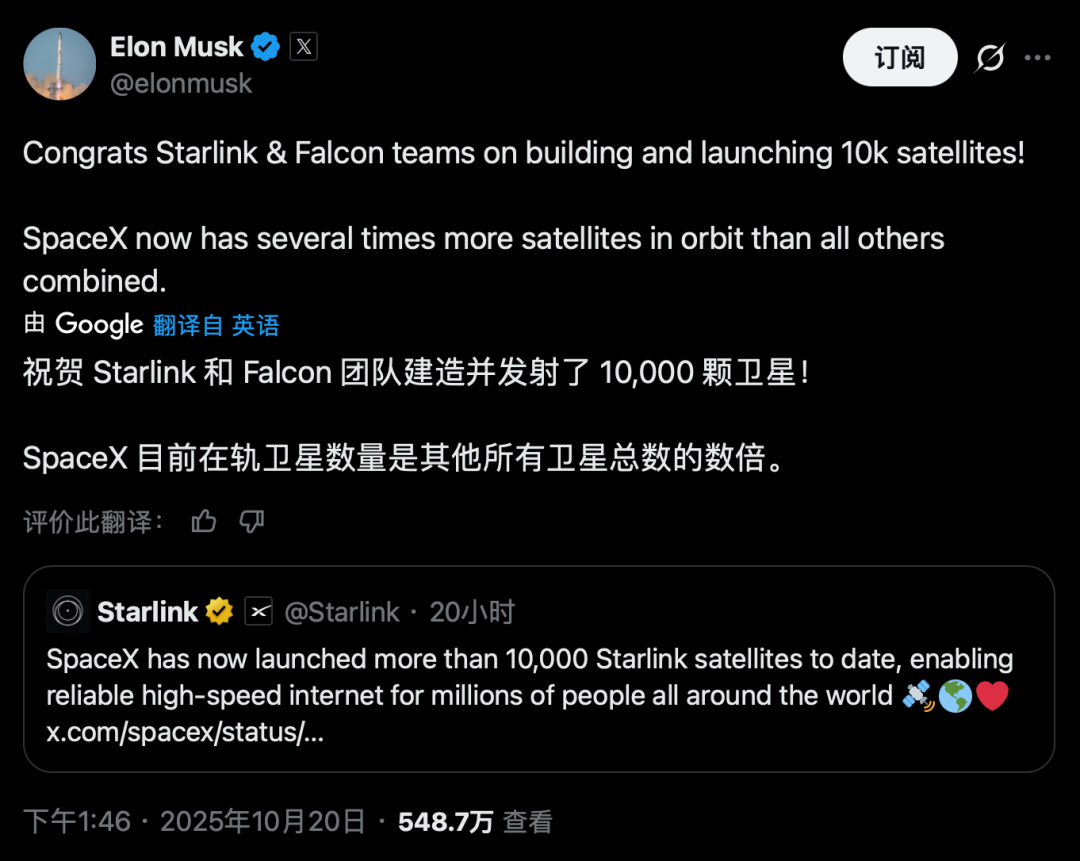 10月20日,马斯克在X平台上发帖庆祝:“恭喜星链和猎鹰团队建造并发射1万颗卫星!SpaceX现在在轨卫星数量是全球其他所有卫星总和的好几倍。”这则帖子迅速点燃网络,收获超过5百万浏览量。它引用了星链官方账号的声明:“SpaceX迄今已发射超过1万颗星链卫星,为全球数百万民众提供可靠的高速互联网️❤️。”