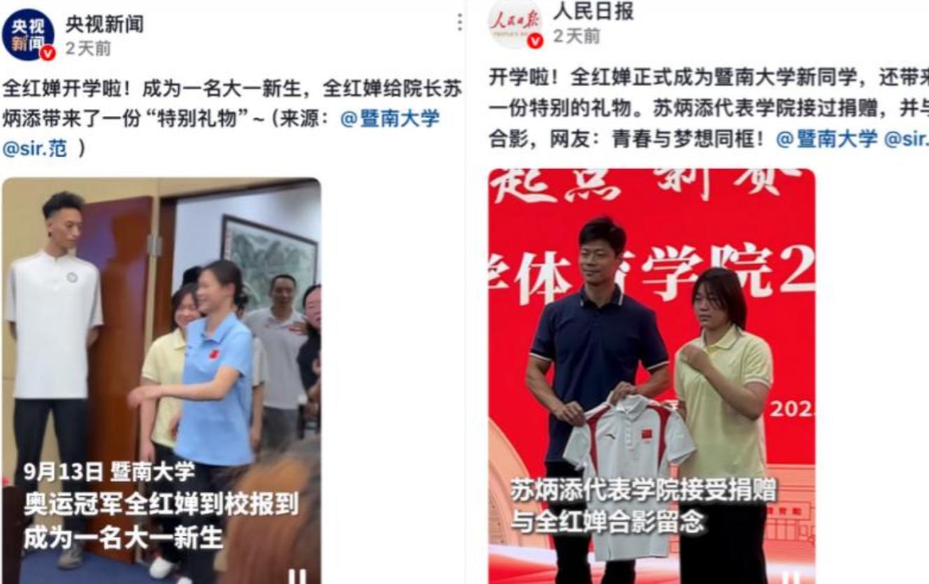 在开学典礼上,全红婵受到学校的格外重视,被安排在方阵的第一排落座。镜头当中,她佩戴校徽时略显颤抖的手展现了她最真实的心理动态。曾经在奥运赛场的跳台上的全红蝉,以及如今大学生身份的全红婵判若两人。她不仅没有选择高调炫耀自己的身份,也没有特意宣称自己对大学生活的期待。只是在入学那天将自己在巴黎奥运会穿过的职业服送给了学校,上面不仅有全红婵的签名,更多的是见证她成长的痕迹。