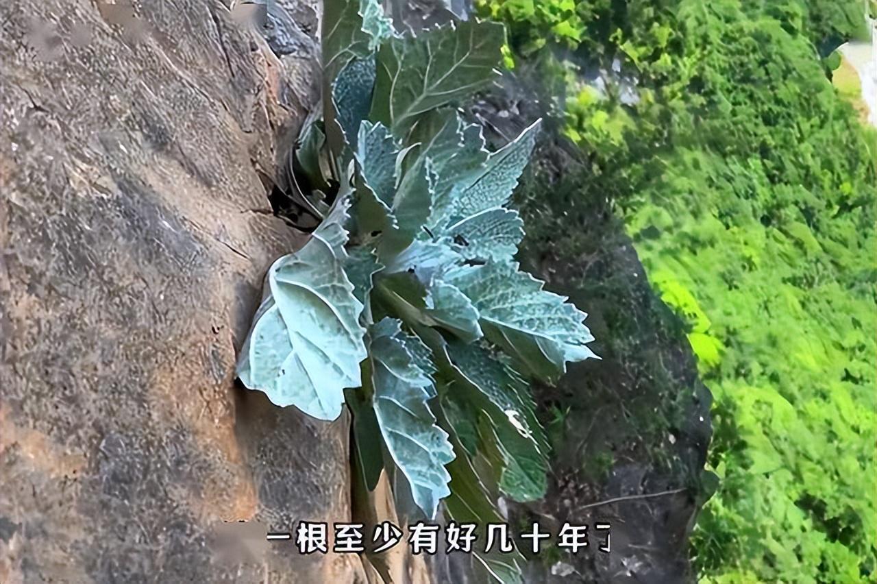 他爬了一会,就在岩壁的缝隙中发现了一丛这种“白菜”,他把镜头转过去,介绍这棵“白菜”至少长了好几十年了。