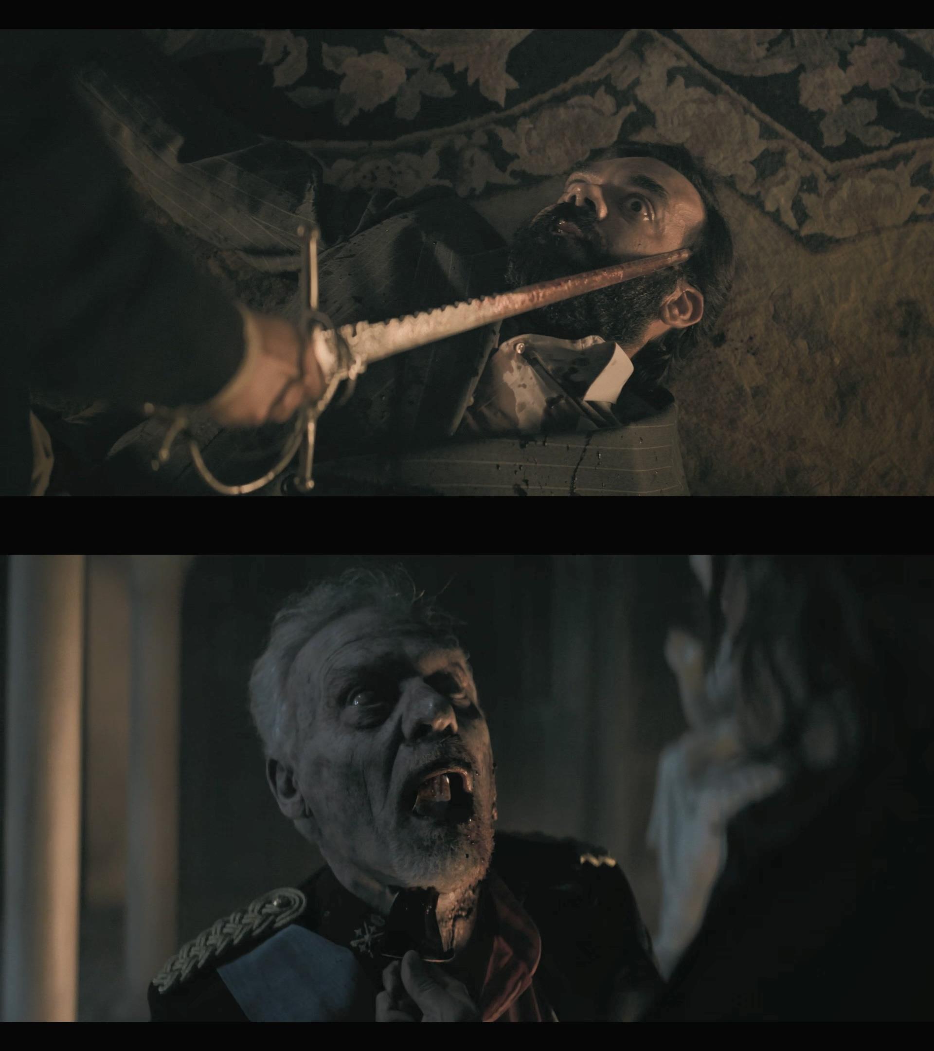 达里尔他们想制造混乱去救人,可宴会厅没有趁手武器怎么办——舞台上不是有现成的行尸么?国王和王后等人还好死不死地坐在舞台下第一排,当场就没了……
