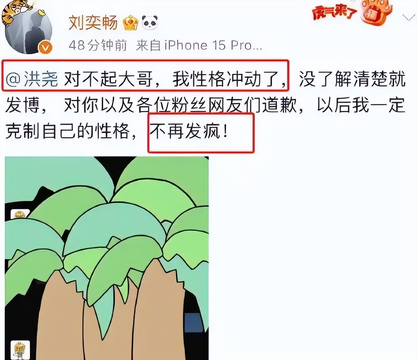 之后,刘奕畅道歉,说自己冲动了,以后不再发疯。