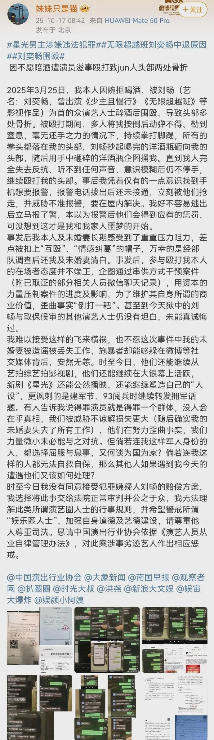 自称3月25号那天,因婉拒了一杯酒,被刘奕畅带着一群醉酒的演艺人士围殴。