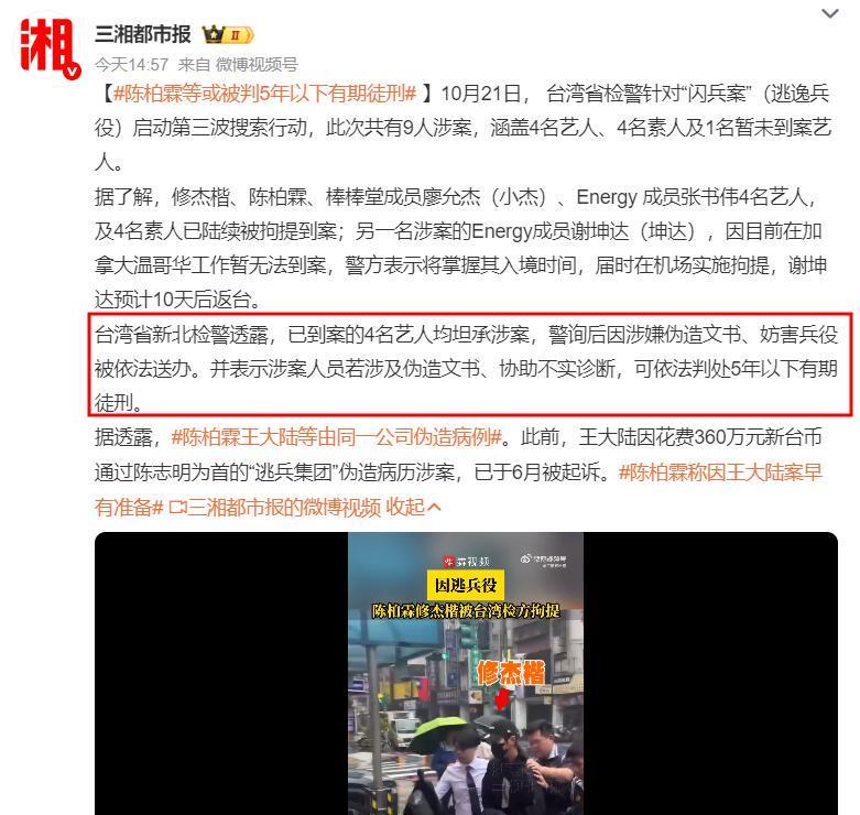 2025年10月21日,原本平静的台湾娱乐圈因一桩重大事件掀起轩然大波。台湾检警展开第三波搜索行动,修杰楷、陈柏霖、Energy成员张书伟、棒棒堂成员小杰等4位艺人因涉嫌逃兵役被拘提,其中修杰楷与陈柏霖两位知名艺人备受关注。