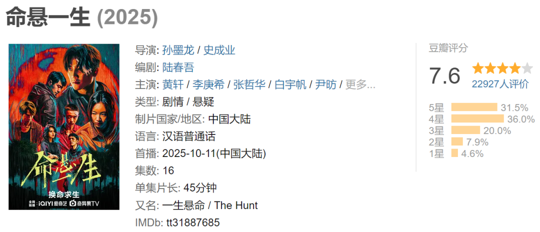 作为正午阳光在悬疑剧领域的实验之作,《命悬一生》延续了其年代感、服化道考究等特色,同时关注底层青年命运等社会议题。对迷雾剧场而言,该剧从口碑层面证明自身价值——年初《漂白》以集均5000万+播放量证明市场热度,如今《命悬一生》则通过豆瓣7.6分巩固口碑基础。