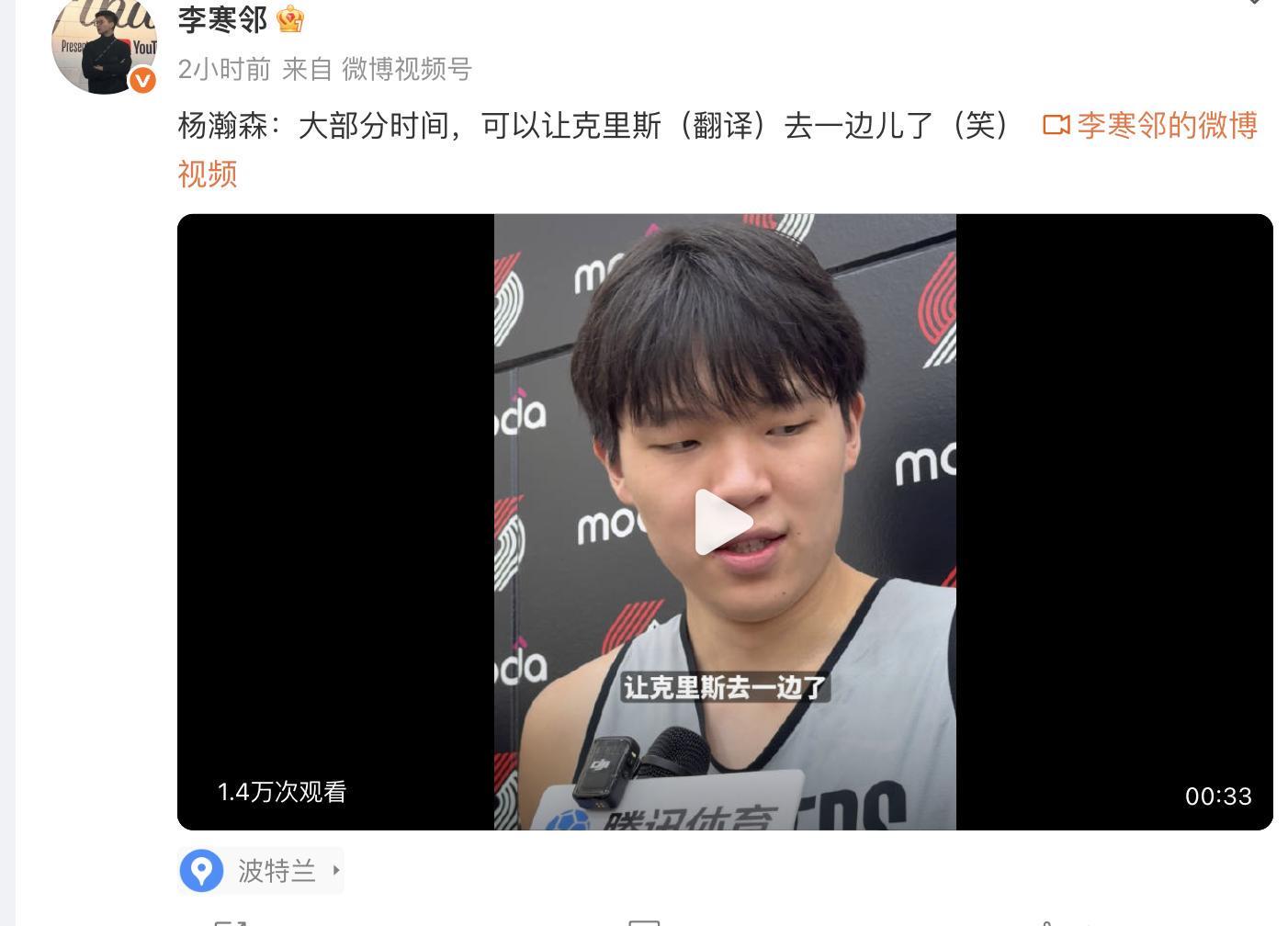 除了恩师的现场支持外,杨瀚森还收到了另一个好消息。据前方记者透露,在最新的采访日中,杨瀚森已经能够独自听懂国外记者的采访内容,这标志着他的英语水平有了显著的进步。对于一名想要在NBA赛场上立足的球员来说,良好的英语沟通能力是至关重要的。它不仅能够帮助球员更好地理解教练组的战术安排,还能促进与队友之间的沟通与协作。因此,杨瀚森英语水平的进步,无疑为他在NBA的发展奠定了更加坚实的基础。
