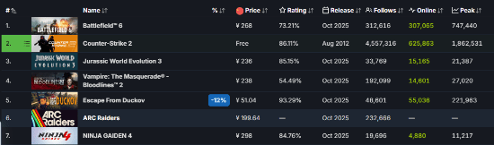 值得注意的是,虽然《忍者龙剑传4》首发加入了Xbox Game Pass,这在一定程度上可能分流了Steam端的销量,但即便如此,该作在Steam全球热销榜上的排名也仅位列第八,落后于《吸血鬼:避世血族2》、《逃离鸭科夫》、《战地6》等多款新作。这一排名结果无疑让许多期待已久的粉丝感到意外。