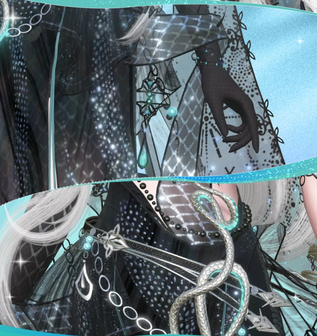 女款时装设计简约而不失华丽,以黑色与银灰色为主色调,上衣、下裙及飘带上布满了精致的蛇鳞纹路,走动间仿佛蛇身游动,完美贴合了蛇精的形象。同时,时装中还巧妙融入了蛇形元素,如颈部的饰链和腰间的锁链,这些细节与华丽的衣裙相得益彰,更添妖异之美。