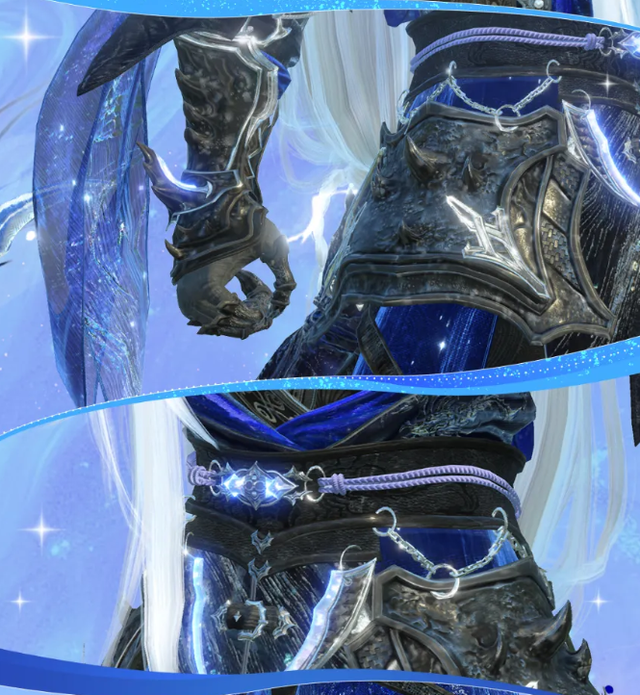 不同于女款时装的妖异柔美,男款时装则更加凌厉霸气。蝎钳状尖角金属额饰和标志性头冠彰显出蝎子精的凶猛,外罩上的黑色鳞甲则复刻出了蝎身的甲壳质感。冷硬的金属配饰与飘逸的衣摆相结合,刚柔并济,展现出独特的魅力。