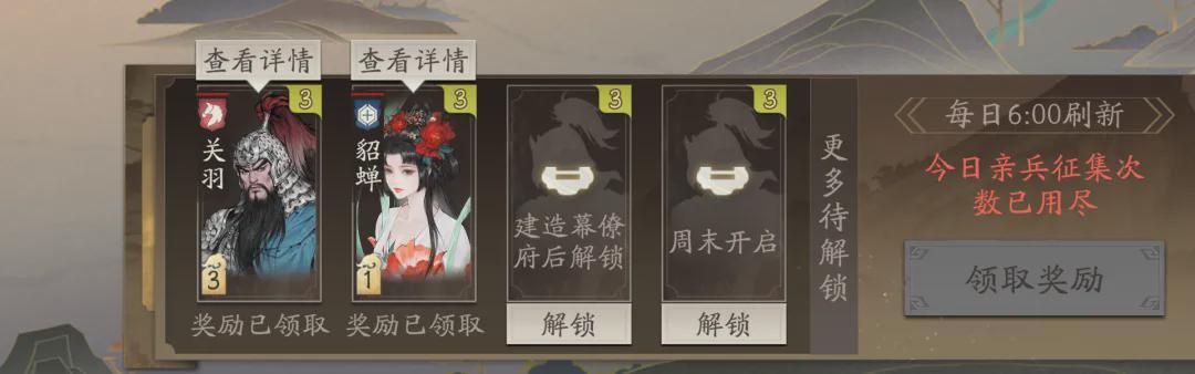 最后补充几点。在一些地图上会隐藏宝箱或人物的直线任务,大家可以随意探索,例如汜水关大营和主城都有不少。此外,游戏还有武将碎片的跑片系统。第一天我选择了跑关羽和貂蝉的碎片,大家可以根据自己的情况选择。将武将升到最高星级(游戏里叫升迁,共10级)其实比较困难,所以我准备部分角色不追求满星,拉到核心门槛即可。例如貂蝉我准备慢慢跑到第5阶。另外,在部分战斗中手选武将进行单挑也可以获得碎片,有这方面需求的朋友可以特别注意。