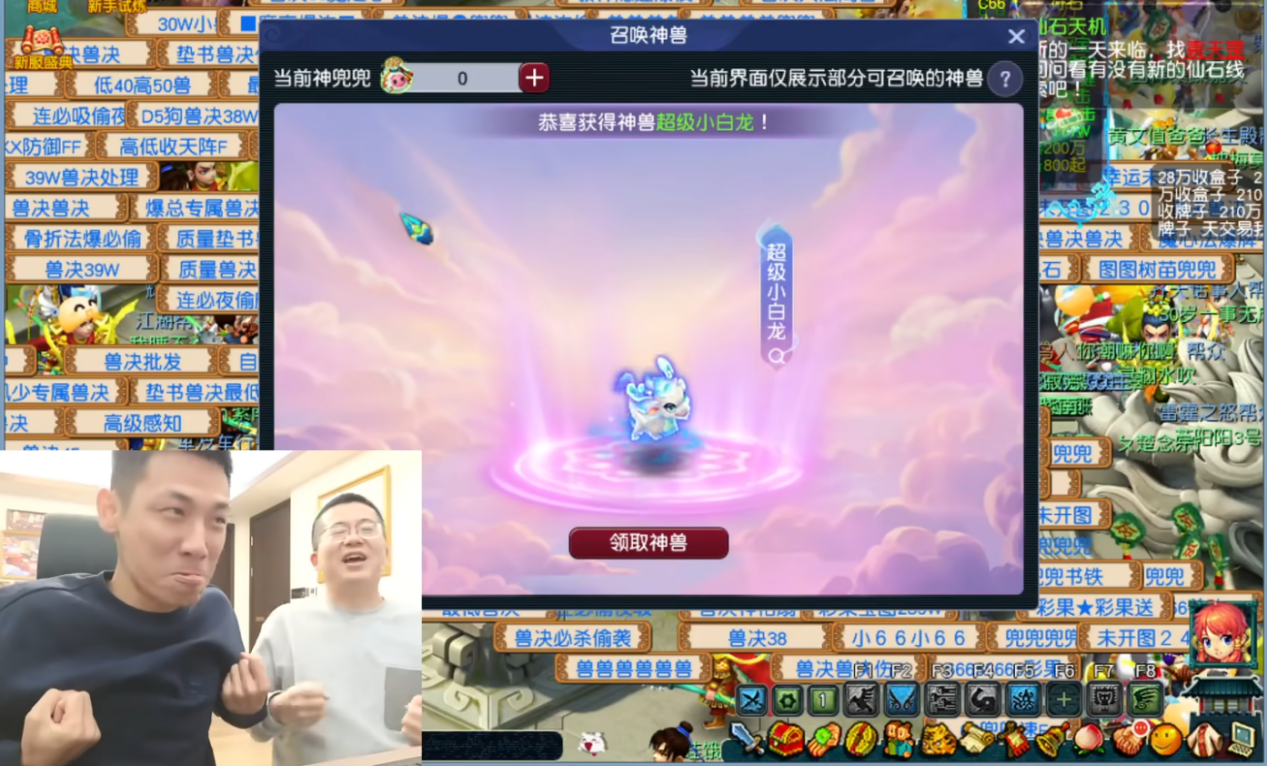 神兽开奖环节高潮迭起,前20次开启中旭旭宝宝两次触发神佑特效,以2积分优势力压沙子哥夺得内部比赛亚军。眼见迟迟未出小白龙,遂发起'有福之夜'联动活动,邀请多位主播共同参与。经过四十余组神兜兜消耗后,最终由本人在第50次尝试时亲自斩获目标神兽。