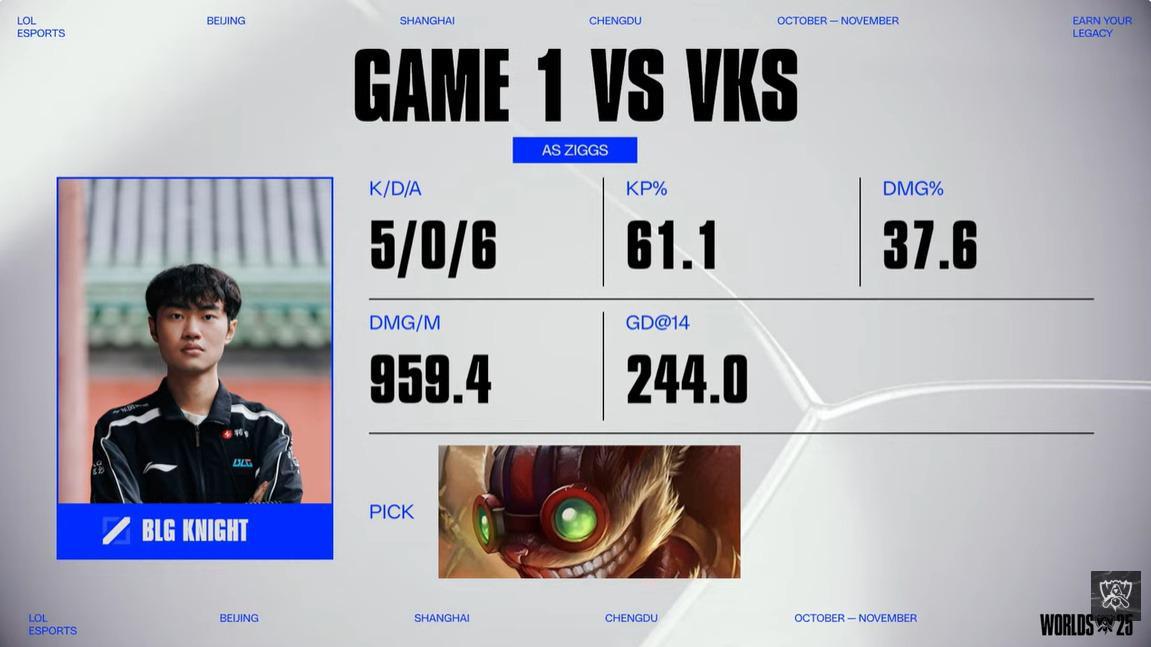 进入中期,21分钟时BLG拿下厄塔汗,VKS开团打残BLG众人,但沙皇的失误被秒,BLG趁机反推掉VKS中路一塔。25分钟时,BLG主动打大龙,VKS的琪亚娜抢龙失败被秒,BLG打出1换5团灭VKS。26分钟,shadow的巨魔在野区单杀琪亚娜。29分钟,BLG无伤拿下听牌龙。最终,在29分钟时,BLG从野区杀到高地击杀VKS四人后,成功拿下首局胜利。MVP荣誉归属于Knight的炸弹人。