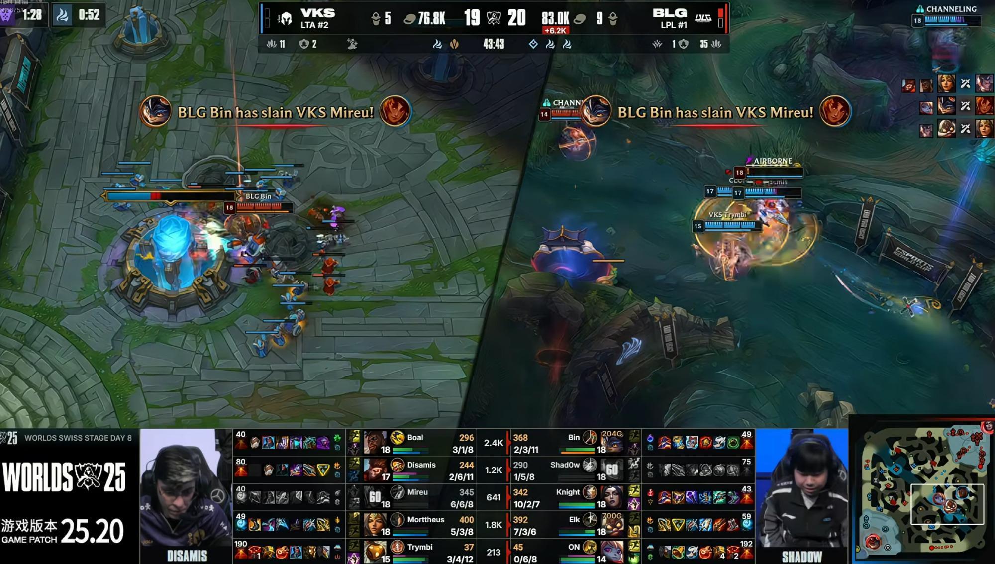 进入中期,18分钟时VKS多人在上路抓死Knight的妖姬,但之后BLG其他人想要反打,先击杀巴德后,BLG追击上头,VKS反杀BLG三人。23分钟时,BLG主动打厄塔汗,VKS姗姗来迟,BLG顺利拿下厄塔汗。之后双方互相发育,直到后期32分钟时双方在大龙坑混战,VKS追人自乱阵型,BLG打出3换5团灭VKS后,拿下第一条大龙。39分钟时,Knight的妖姬找机会秒掉VKS的希维尔,BLG拿下第二条大龙。然而,在42分钟时,VKS在野区埋伏抓死BLG中辅2人,并在中路推进。此时,Bin的兰博TP到高地偷家,成功帮助BLG获胜。