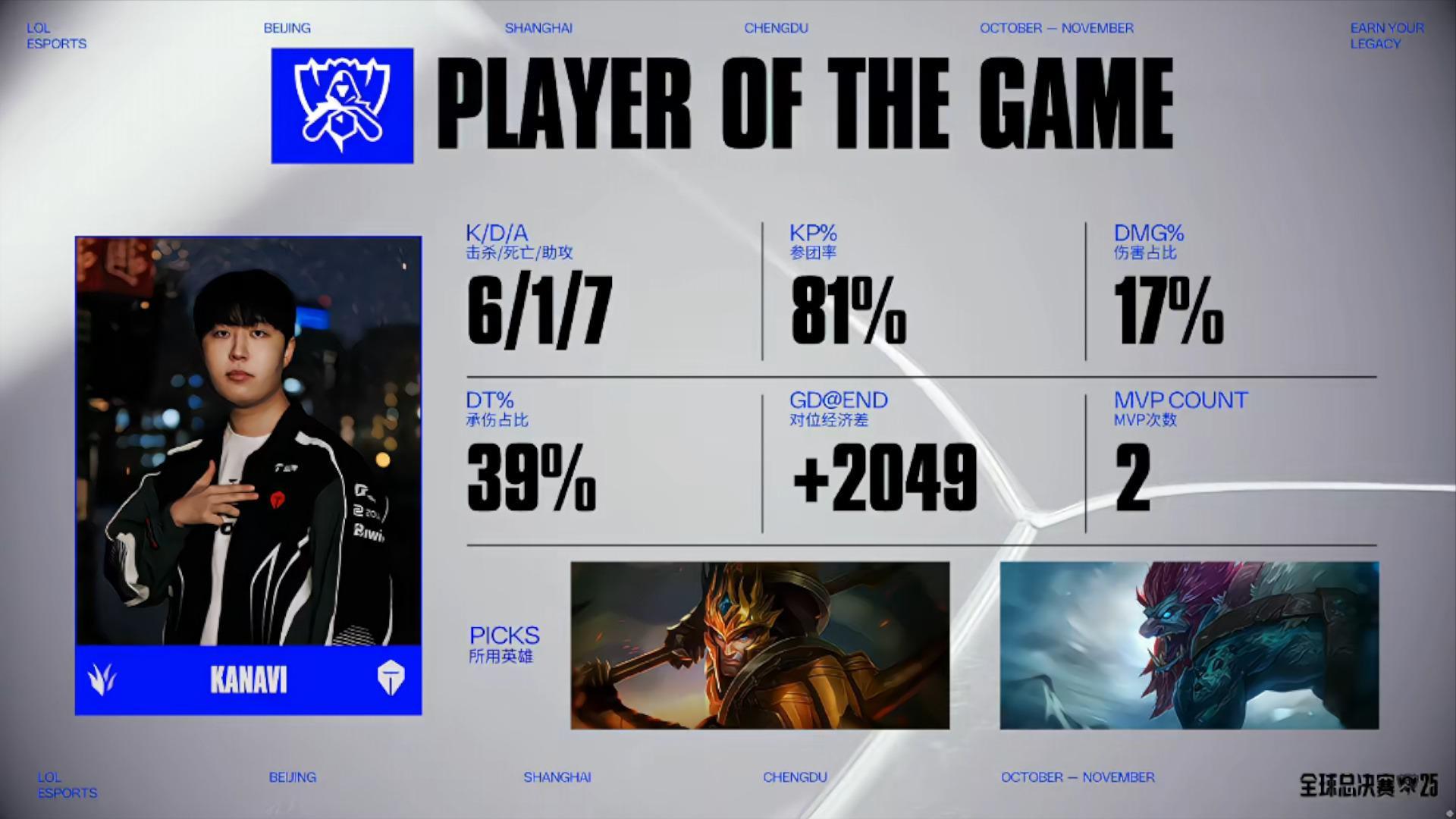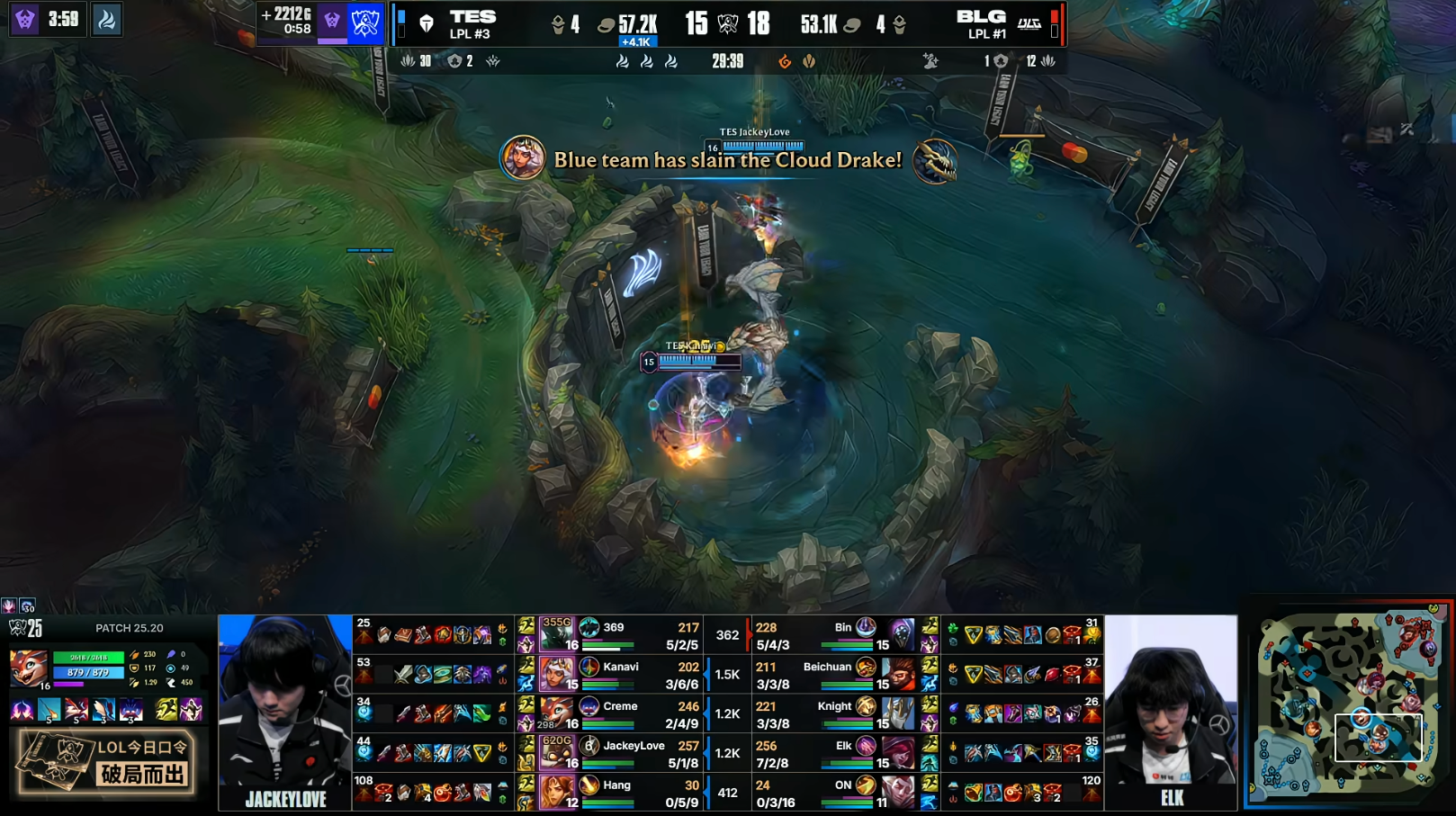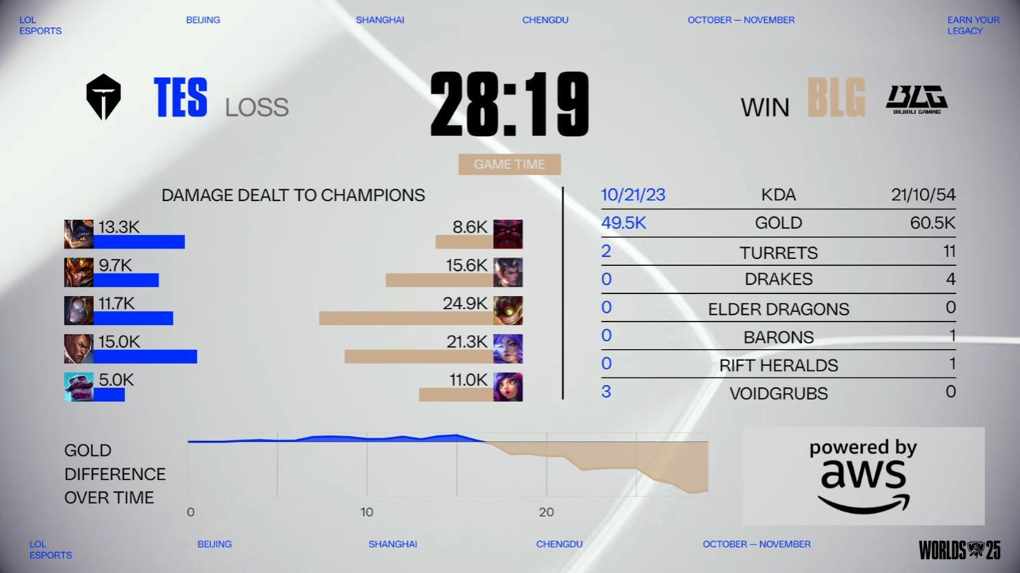 中期17分钟ON妮蔻下路越塔开团击杀TES上辅,BLG拿下听牌龙。19分钟TES四人抓上击杀Bin奥恩,但Creme发条在中路被击杀,BLG趁机推掉TES中路高地塔。23分钟BLG打残Kanavi皇子后拿下水龙魂,25分钟五人包夹击杀Kanavi和JKL卢锡安后拿下大龙。最终28分钟BLG高地团灭TES,首局Knight炸弹人以最高伤害领跑,TES方面JKL卢锡安伤害最高。