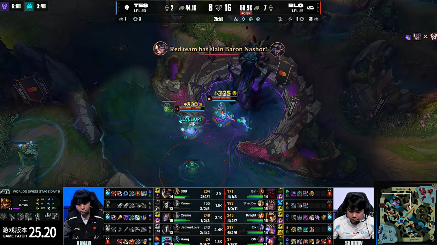 比赛初期,Kanavi的皇子3级抓下击杀Elk的芸阿娜,帮助TES下路打开局面。阿水卢锡安换线至上路后,与皇子配合越塔击杀ON的妮蔻。尽管369的兰博在下路成功抗住BLG上野越塔,但BLG通过9分钟抓死369兰博,并利用阿水“卖身位”诱敌深入,反杀TES上野组合,逐渐掌握主动权。