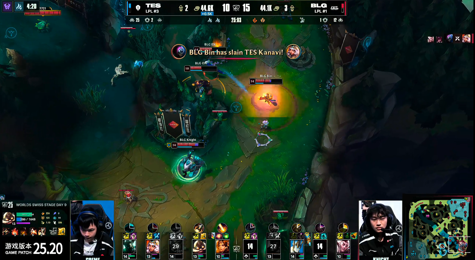 比赛初期,TES四人越塔被Knight支援反打,BLG完成1换2并控下巢虫与第一条小龙。尽管Bin贾克斯在边线逐渐疲软,但BLG通过15分钟抓死Kanavi与Hang,顺势拿下先锋。Bin贾克斯随后单杀小奶油小火龙,遏制其发育。