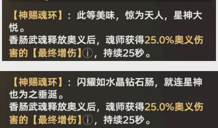 这款被玩家称为「香肠神赐」的魂环,可为角色提供25%的奥义伤害加成。实测数据显示: