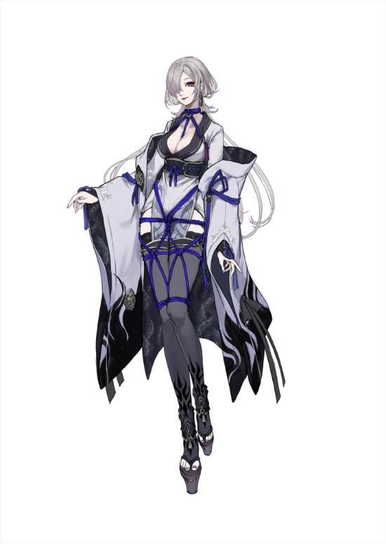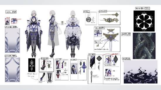 从曝光的设计图中可以看到,Seori的服装设计兼顾战斗功能性与视觉美感。白色发丝与蓝色绳结形成鲜明对比,而若隐若现的服装剪裁更凸显其御姐气质。这种将实用与美感结合的设计理念,正是《忍者龙剑传4》角色设计的精髓所在。