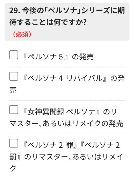值得特别强调的是,这是Atlus官方首次在公开问卷中直接使用"《女神异闻录6》"这一名称进行玩家意向调研。此前该系列新作虽长期处于传闻阶段,但始终未获得官方明确确认。