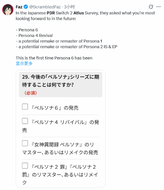 近日,日本游戏开发商Atlus在一项针对《女神异闻录3:Reload》与Switch 2平台的玩家调查问卷中,首次以明确选项形式提及了《女神异闻录6》的存在,引发系列粉丝的广泛关注。