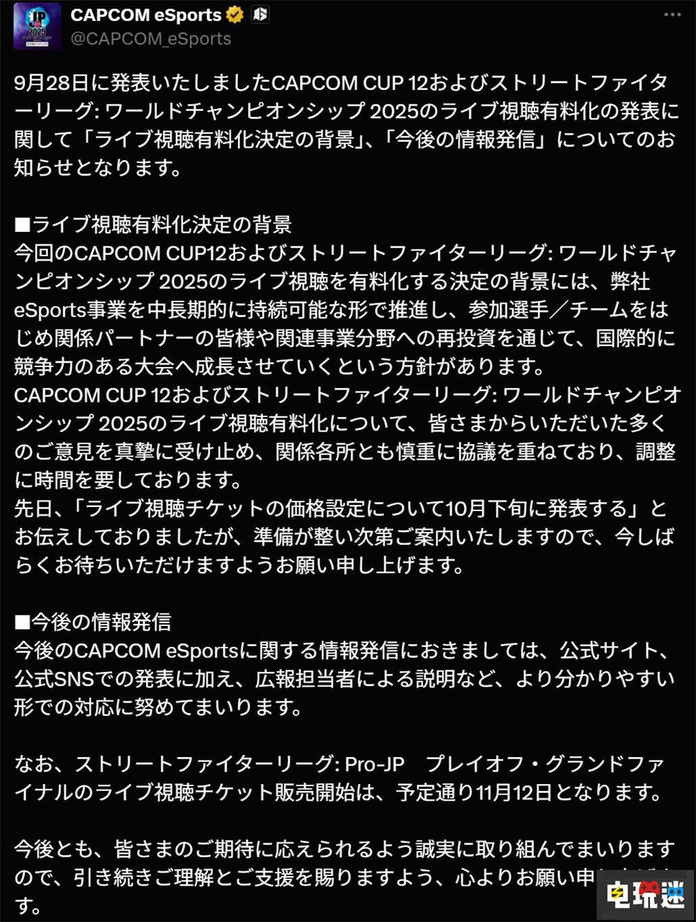 卡普空电竞赛事官方社交账号发布长文解释称,采取付费直播模式是为了能够可持续地推动公司电竞业务的中长期发展。官方表示,他们的目标是将街头霸王联赛以及Capcom Cup打造成具有国际竞争力的赛事。同时,卡普空也承认这一决定可能会引发不同意见,目前正在与相关方积极探讨并协调付费直播的具体方案。一旦准备就绪,将立即公开付费方案的详细内容。