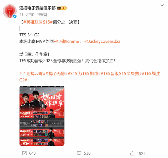 赛后,@滔搏电子竞技俱乐部 官方微博第一时间发布战报,配文“燃旧障,作华章!TES成功晋级2025全球总决赛四强!我们会继续加油!”短短半小时内,该动态便收获超10万点赞,评论区被“LPL之光”“剑指冠军”等留言刷屏,粉丝热情持续高涨。