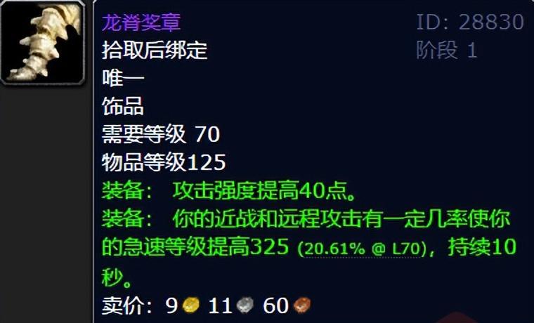 龙脊奖章,出自格鲁尔巢穴,虽然常驻攻强只有40点,看似不如牌子饰品嗜血胸针的72点,但其被动效果——10秒内提升325点急速等级,却让这款饰品成为了TBC版本中最保值的装备之一。急速属性的提升对于物理职业来说至关重要,而龙脊奖章的极致成长性更是让它成为了无数玩家的首选。可以说,龙脊奖章不仅是TBC版本的代名词,更是超级神器的存在!