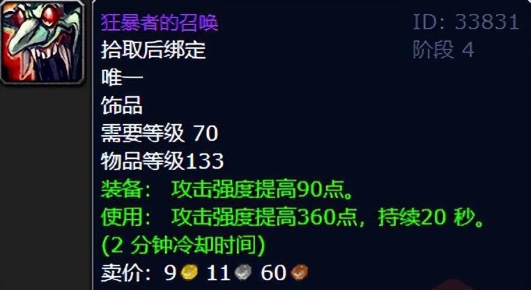 祖阿曼团本,作为小号和排骨玩家的福地,其掉落的狂暴者的召唤无疑是物理系大佬们的最爱。这款饰品的出现,甚至让背叛者的疯狂都黯然失色。在怀旧服时期,狂暴者的召唤基本上3000到5000金币就能轻松入手,而祖阿曼团本周转快,性价比极高,绝对是高攻强饰品的首选之一。