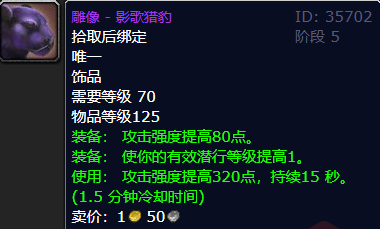 珠宝加工制造的雕像影歌猎豹,图纸通过破碎残阳声望崇敬获取。对于珠宝加工玩家来说,制作成本几乎可以忽略不计。这款饰品对于热衷于PVP的盗贼来说,简直是神器般的存在。绿字面板收益完全吸收,潜行等级提升让你犹如鬼魅般出现在布甲身后,一套可控爆发搭配自身技能,哪个布甲职业能顶得住?