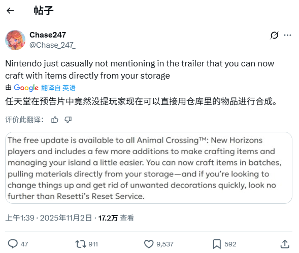 任天堂在Switch 2版本升级包的商店页面中明确指出:“此次免费更新面向所有《集合啦!动物森友会》玩家,新增了多项功能以简化道具制作和岛屿管理流程。现在,你可以轻松批量制作道具,并直接从仓库中提取所需材料。”