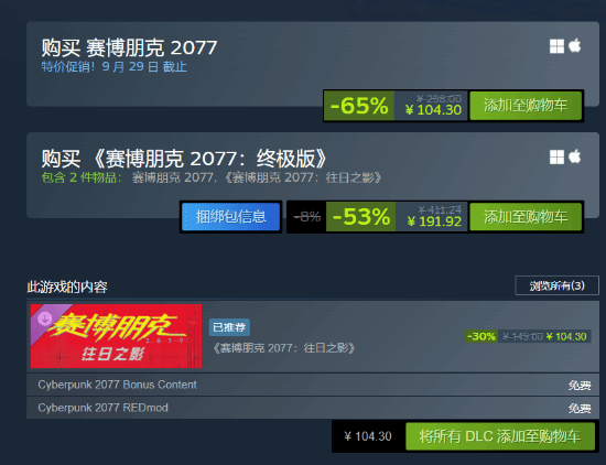 CD Projekt RED(简称CDPR)近日在Steam平台开启了盛大的促销活动,旗下多款热门游戏均参与其中,为玩家们带来了前所未有的优惠力度。其中,备受瞩目的《赛博朋克2077》更是迎来了史低价格,标准版仅需104.30元,而终极版也仅售191.92元,这样的价格对于一直期待体验这款未来科幻大作的玩家来说,无疑是一个绝佳的入手时机。活动将于9月29日截止,感兴趣的玩家可要抓紧时间了!