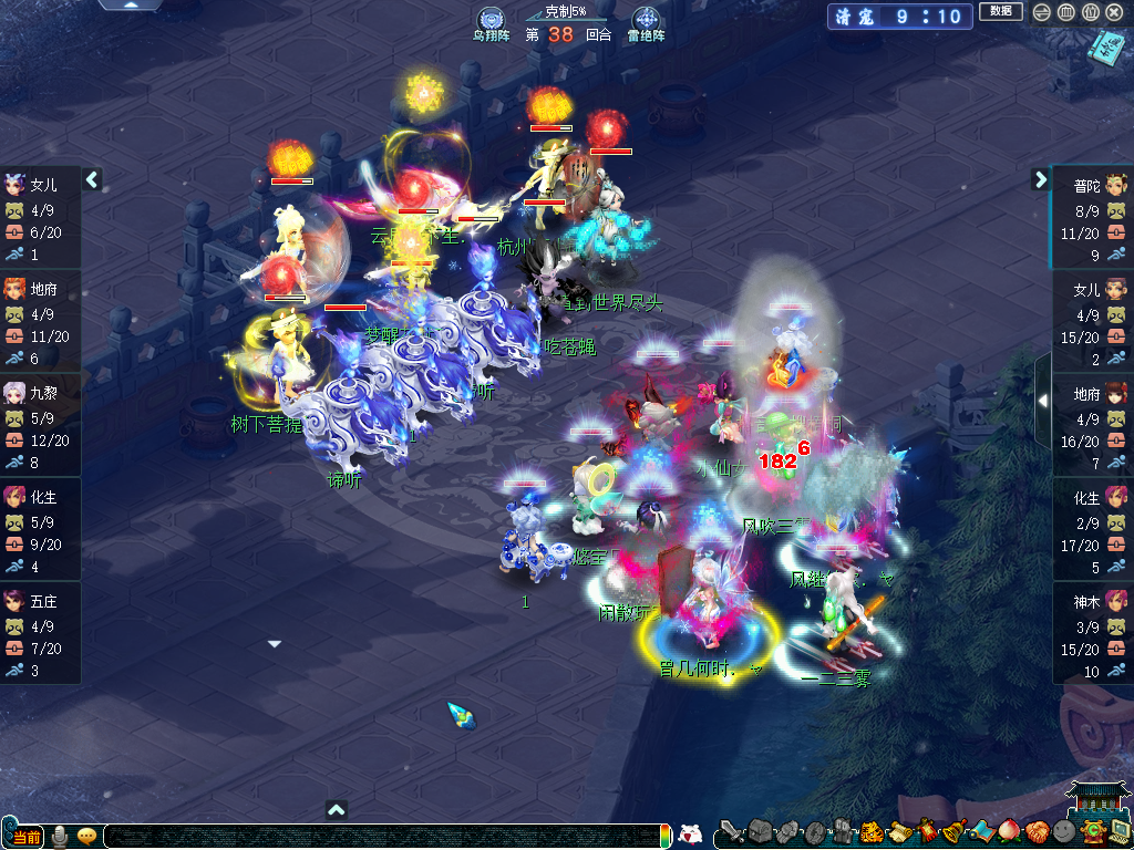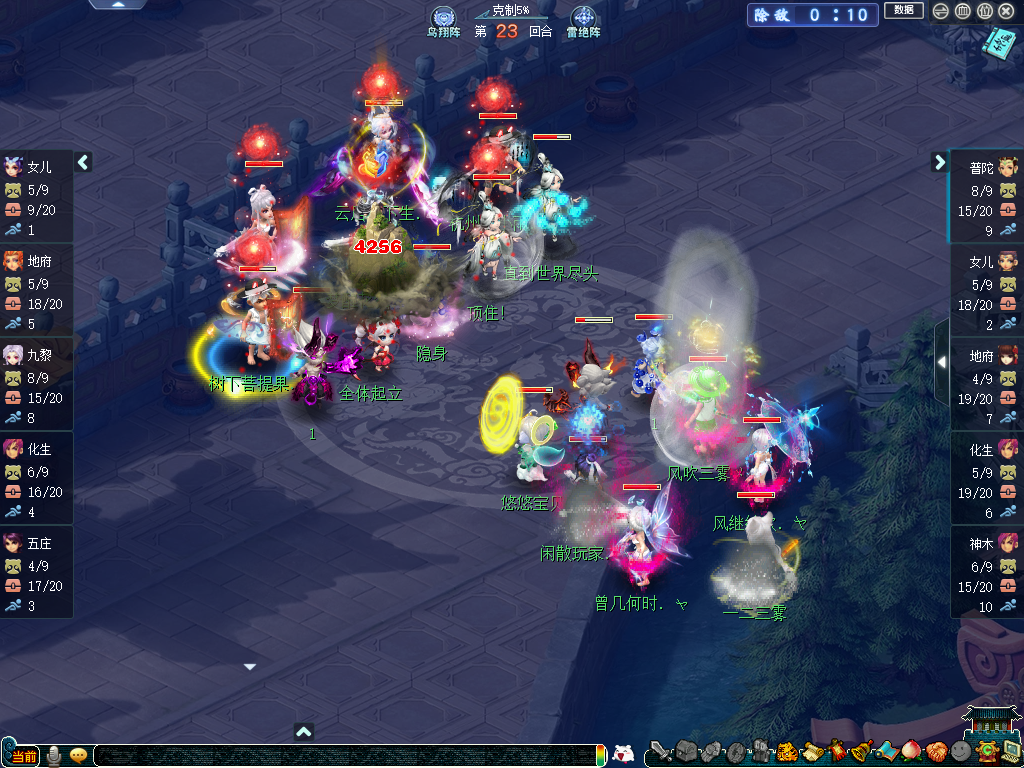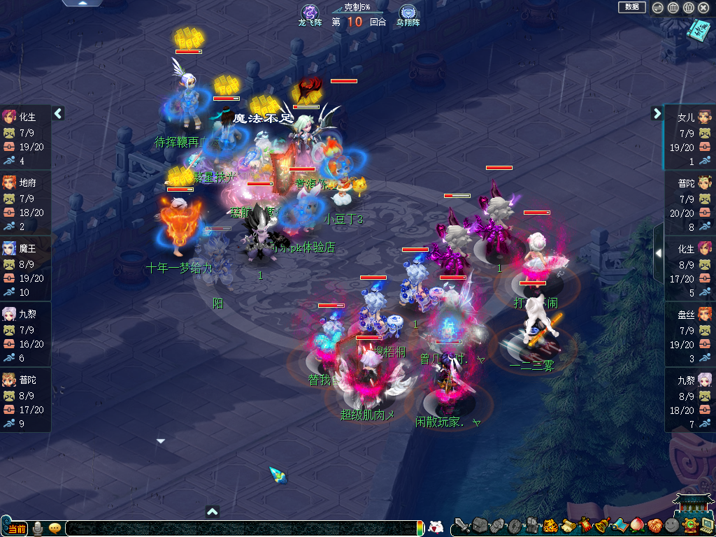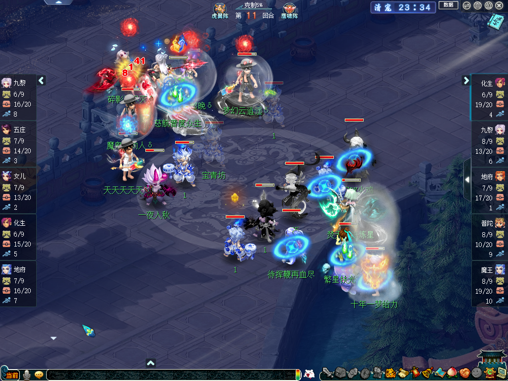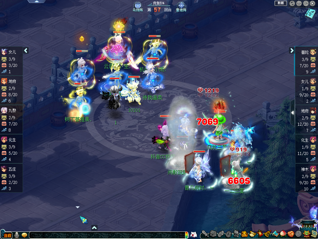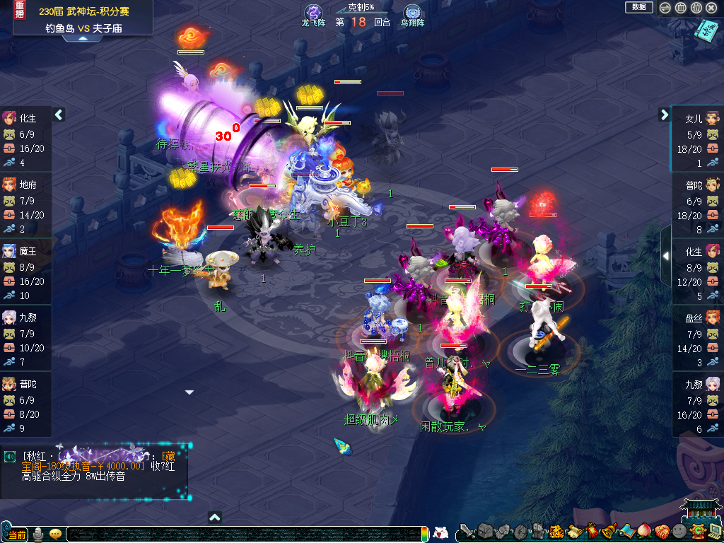 积分赛第三轮,另一场焦点战在钓鱼岛(观战方)与紫禁城(对战方)之间展开。钓鱼岛选用了由“咒师普陀、女儿、地府、化生、神木”组成的“四保一”点杀体系,而紫禁城则采用了“女儿、地府、九黎、化生、五庄”组成的类似体系。
