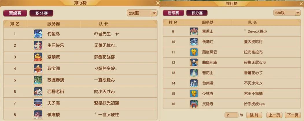 淘汰赛名单如上图所示。总的来说,第230届武神坛积分赛中,不仅刚刚合体的夫子庙表现出色,更换指挥体系的紫禁城、珍宝阁等服务器也走出了阴霾。相信在接下来的比赛中,他们能继续延续今天的状态,创造更加辉煌的战绩!