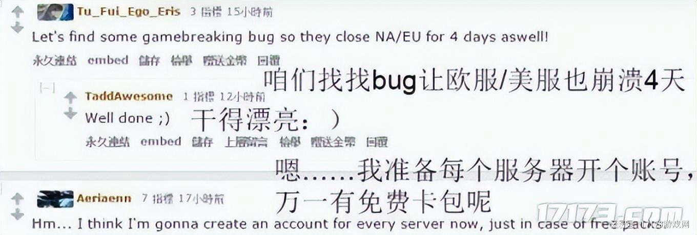 需要提上一句的是,2017年1月21日前后,在外服大神的不懈努力之下,这个炸服BUG还真被他们给复刻了,导致外服也维护20多个小时才修复好。