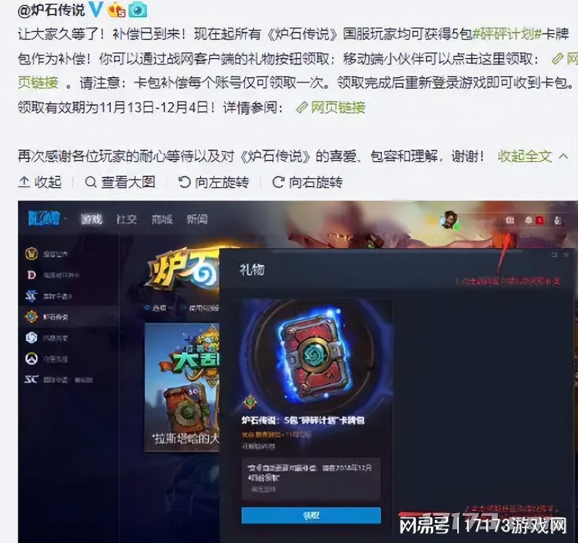 也不知道是不是有什么玄学,自从第一次炸服之后,《炉石传说》游戏内的BUG渐渐多了起来,而补偿发放也慢慢走向了标准化、正规化。
