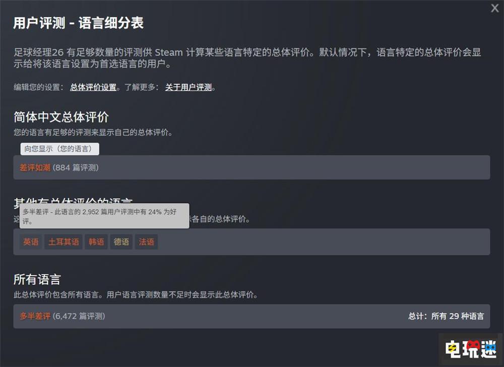 作为Sports Interactive首款采用Unity引擎打造的《足球经理》系列新作,《足球经理26》在Steam平台首发后遭遇了意料之外的口碑滑铁卢。这款历经长期打磨的作品,不仅未能延续系列往日的辉煌,反而因激进创新引发了核心玩家群体的强烈不满。截至当前统计,游戏Steam版全球综合评价已跌至'多半差评'区间(好评率仅22%),简体中文区评价更呈现'差评如潮'的惨状(好评率5%)。
