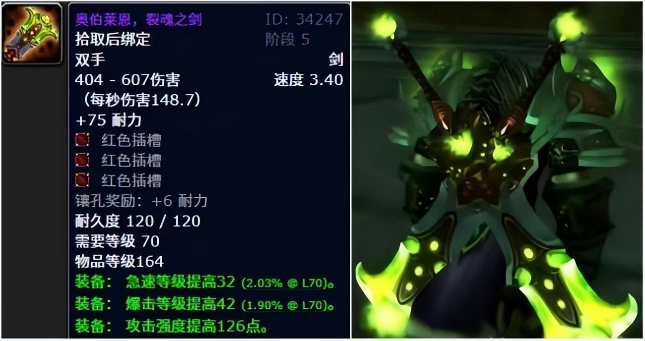 对于没有双刀的狂暴战和惩戒骑来说,基尔加丹掉落的奥伯莱恩裂魂之剑无疑是最佳选择。三猩红色插槽和完美的绿字面板,使其成为双刀之下最强的双手武器。后期甚至有不少猎人玩家也选择扛上这把武器,体验不一样的战斗风格。