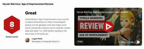 值得一提的是,IGN对本作给出了8分的评价。虽然认为剧情或许未能充分展现其作为《塞尔达传说:王国之泪》前传的叙事潜力,但在游戏性方面却弥补了这一遗憾。游戏通过将原作中最具创意的机制与以一敌千的无双体验相融合,创造出了系列目前最出色的动作系统,让玩家在战斗中能够感受到前所未有的畅快与刺激。