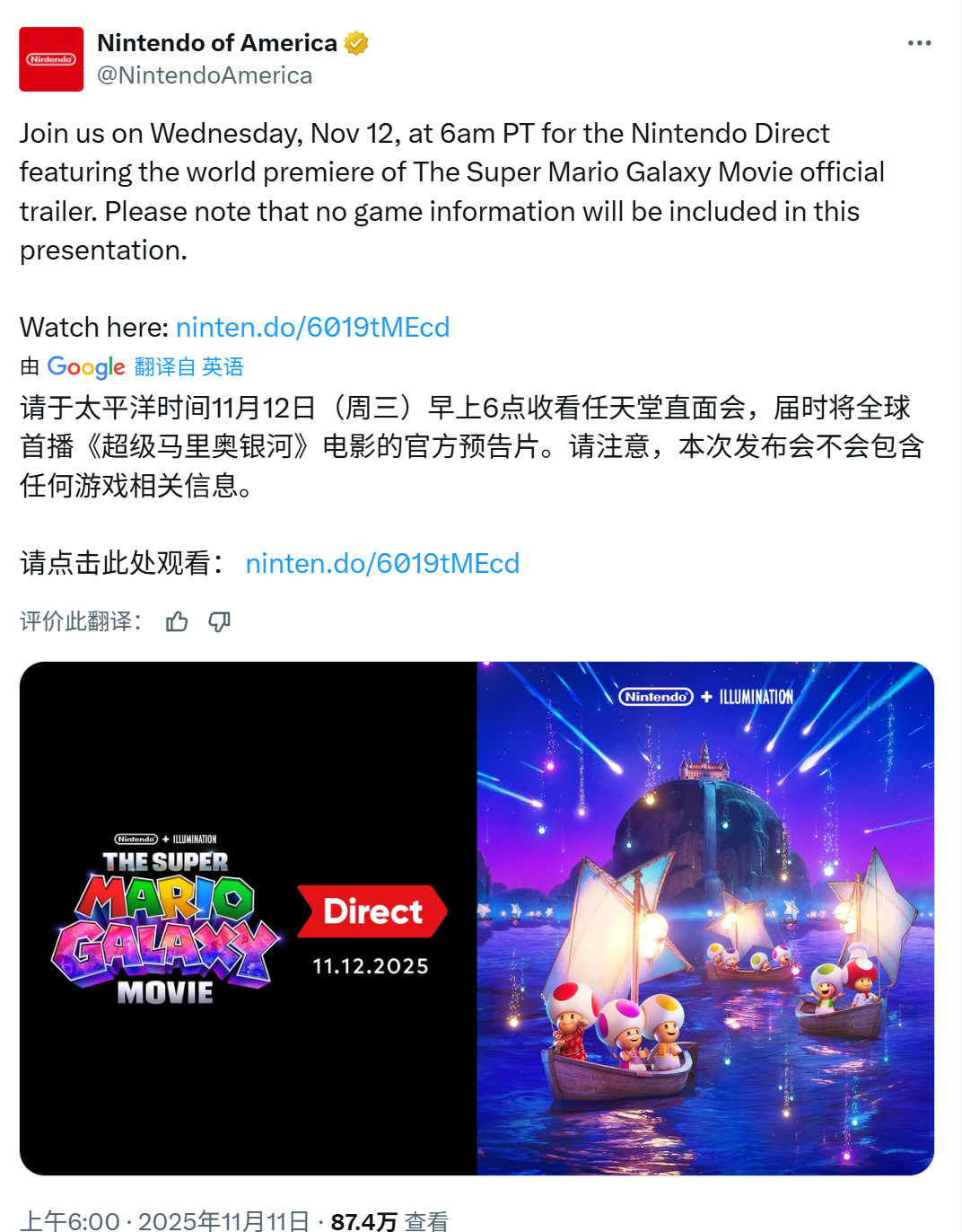 任天堂官方推特近日宣布,将于北京时间11月12日晚上9点开启新一期任天堂直面会。此次直播的焦点是《超级马里奥银河大电影》的首支完整宣传片,该片将进行全球首播。值得注意的是,任天堂特别强调,本次直播不会涉及任何游戏相关的新消息。