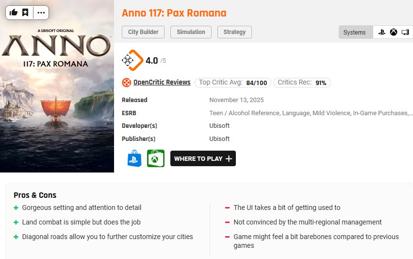 《纪元117:罗马和平》是款令人沉醉的古风城建游戏。规划新城区的布局,或是静静注视着高架水渠旁林荫大道上熙攘的人流,就让我投入了数十小时。这个系列与我或许早有缘分,只是阴差阳错始终未能相知。如今我终于领悟其精髓,内心充满欣喜——精妙深邃的贸易系统,配上激动人心的海战玩法,堪称锦上添花。战役模式或许见仁见智,但高度自定义的无限模式始终让我意犹未尽。这般杰作虽未至凯旋庆典的辉煌,但绝对值得起立喝彩。