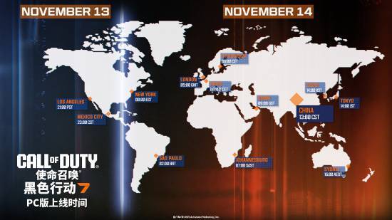 《使命召唤》官方今日发文宣布,《使命召唤22:黑色行动7》现已开放预载!同时官方还释出了PC版的游戏上线时间图。国内玩家可以在11月14日13:00开玩。