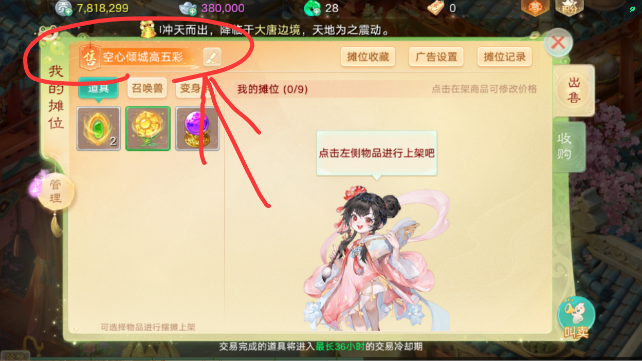 交易服开放首日,达到65级后即可解锁摆摊功能。建议开通三日卡,在长安城进行摆摊交易。将摊位名称修改为“你的游戏昵称+出售物品”,例如“空山倾城,高五彩”,并截图保存。将截图上传至活动页面,即可获得一次抽奖机会。