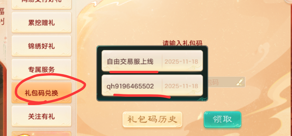 在游戏内礼包兑换处输入:自由交易服上线,即可领取凝魄丹、伙伴修炼册等奖励。此外,建议大家多留意系统邮件,预约奖励以及抱团活动等现金红包福利,都在这里面发放。