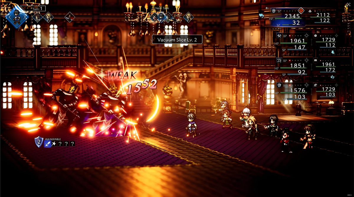 在战斗系统方面,《歧路旅人0》依然保留了系列传统的回合制玩法,不同职业的特色技能、以属性克制推动的护盾破防机制、选择性使用的BP强化点数等经典元素均得以保留。在此基础上,本作进行了诸多革新。首当其冲的是上场参战的队员数量从4人扩充至8人,虽然前作极少数战斗中也曾出现8人同场待命可替换的情况,但本次8人组合成为常驻阵容,并增加了前后布阵的概念。前排四个角色负责输出和肉盾,后排四个角色则以辅助效果为主,同一种职业或同一个角色在前置或后置时的作用大不相同。前后排队员可在战斗中自由切换,前排先消耗技能破盾,后排再补刀爆伤害成为可行战术,要求玩家对排兵布阵进行更加严谨的思考。